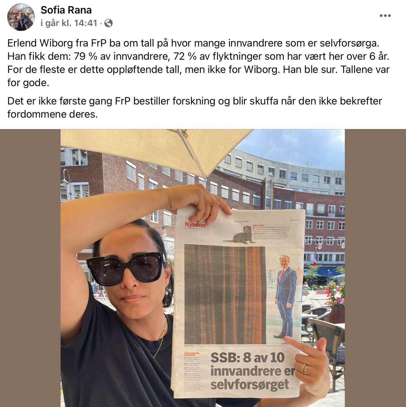 Underforstått: FrP vil ha dårligst mulige tall om innvandring. Noe Sofia Rana fra partiet Rødt gjorde et poeng av på Facebook i går: